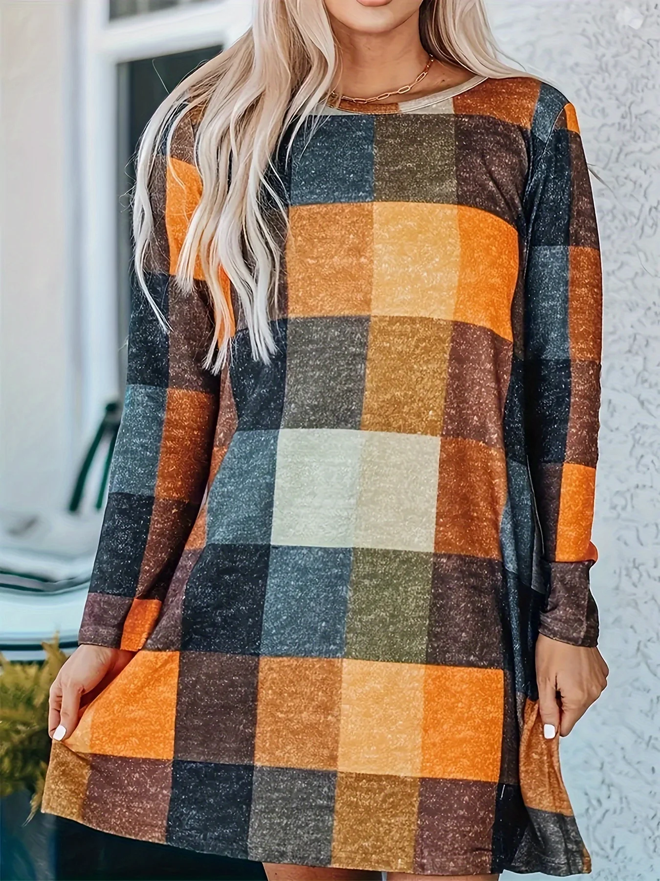 Plus Size Women’s Plaid Print Crew Neck Mini Dress